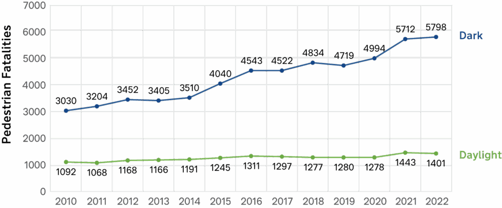 In the most recent findings from the GHSA, published March 5, 2025, 3,304 pedestrians were killed in the U.S. during the first half of 2024. That’s 2.6% lower than in 2023, but still up a staggering 48% from a decade earlier.