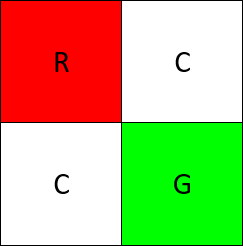 RCCG = Red-clear-clear-green. This CFA is good for differentiating red and green traffic lights. The two clear pixels provide improved luminance information, the color pixels are red and green in this case. The green pixel is more sensitive than the blue that is used in the Bayer Filter and RCCB case which improves low light performance, but removing the blue color filter makes color fidelity more difficult.