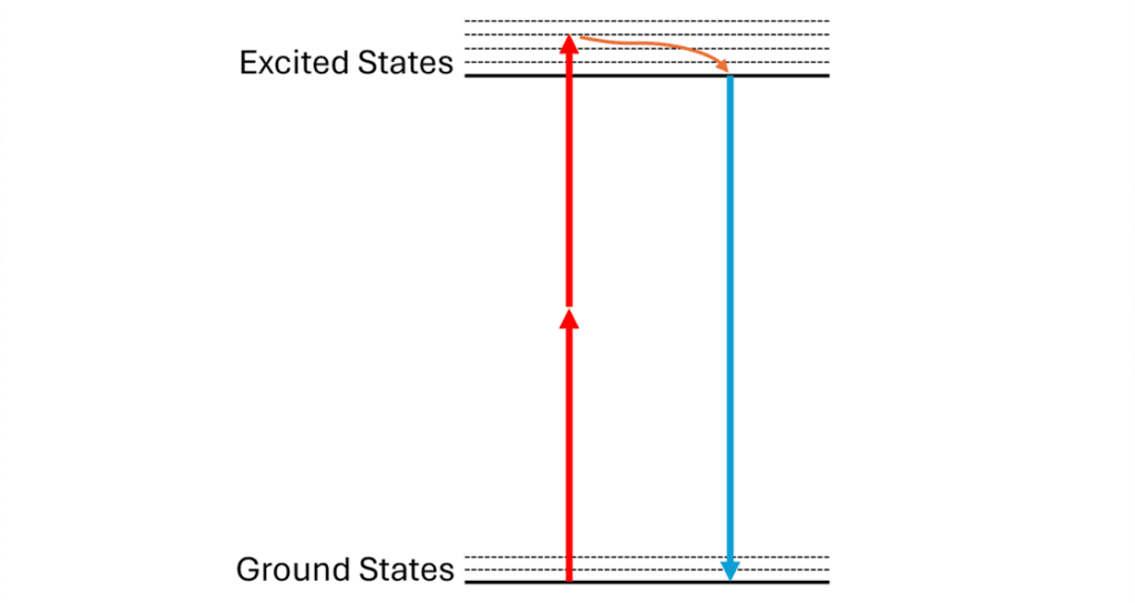 Multiphoton microscopy (MPM) encompasses several advanced techniques for imaging biological samples using nonlinear optical processes. The most common type of multiphoton microscopy is two-photon fluorescence microscopy, where two photons from the laser source are simultaneously absorbed by a fluorophore. A small amount of energy is lost as heat, and then a fluorescence signal is emitted in the form of a single photon with a higher energy (thus a shorter wavelength) (Figure 1). Other techniques, such as Second Harmonic Generation (SHG) microscopy, are energy conserving – no heat is released in the sample from the process. Techniques that rely on the simultaneous absorption of three photons are also common. All these processes allow for deeper tissue penetration and reduced photodamage compared to single-photon excitation1.