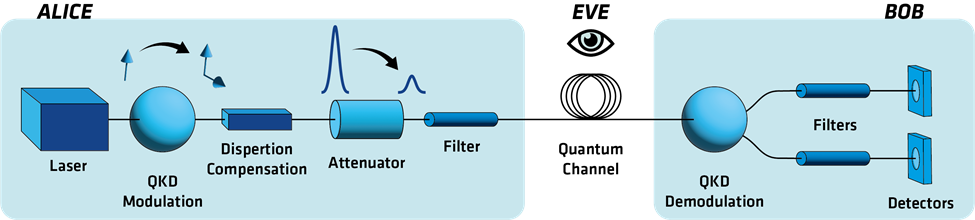 In every schema, Alice sends pulses of polarized photons attenuated to the quasi single-photon level to Bob as Eve, the eavesdropper, tries to intercept it to retrieve information about the secret key. A simplified description of the required optical fiber system for QKD using attenuated pulses is shown in Figure 1.