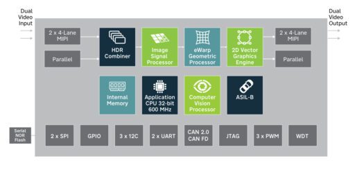 The HDR ISP supports the most advanced HDR, and LED Flicker Mitigation (LFM) techniques available on the latest automotive sensors. The Vector Graphics Engine renders high resolution real-time graphics to overlay on the video stream enabling compelling user interfaces.