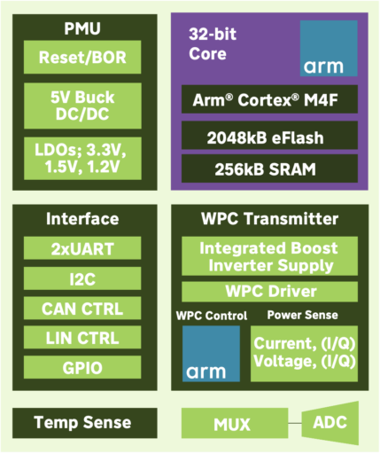 The iND87200 dual-core design combines an Arm® Cortex® M4F processor with 2MB of embedded Flash and 256kB of SRAM with a dedicated Arm® Cortex® M0 processor for the WPC stack. This frees the device to execute user-specific software without compromising the timing and interrupt constraints related to the WPC stack. The device has integrated power management capabilities that enable it to connect directly to an automotive power bus. It also contains a wide range of serial interfaces such as CAN 2.0B, LIN, I2C, and UARTs, supporting multiple connectivity options to the vehicle and other peripherals.