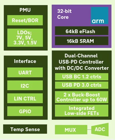 The iND87300 is a dual-channel USB-PD controller with integrated buck-boost that supports USB battery charging (BC1.2) and USB power delivery (PD 2.0/3.0). It is a unique, full-system solution that integrates the low-side FETs and includes an Arm® Cortex® M0 core processor with 64kB Flash and 16kB SRAM to provide system control and flexibility.