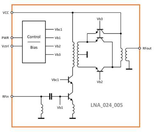 The low-noise amplifier chip features a gain control function that allows selection between low- and high-gain modes, both of which provide linear amplification. The ability to quickly switch between on and off states also allows for a pulsed mode of operation, e.g., to save power through low duty cycles. A power enable pin allows switching between operating and power-down modes to minimize noise exposure if no signal is present.