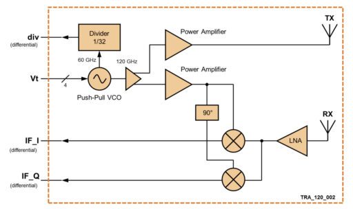 The radar chips provide measurement signals for distance and speed measurement of objects as an analog signal. In combination with a subsequent external signal evaluation at the customer side, possible applications are the investigation of material surfaces, the measurement of layer thicknesses and other properties of the measured objects. The main application area of the 120 GHz transceiver radar front-end is for short range radar systems with an operation range of up to 10 meters. By using dielectric lenses or mirrors, the range can be increased beyond 100 meters.
