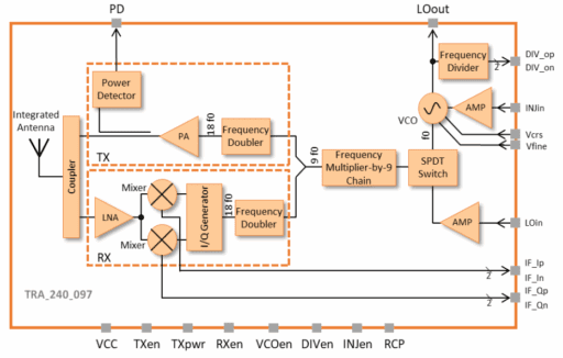 The radar front end TRAˍ240ˍ097 is an integrated transceiver circuit operating in 240 GHz band with on-chip antenna. This cascadable radar frontend combines a 240 GHz operating frequency with a bandwidth of up to 45 GHz and is assembled in a low-cost QFN package. The chip can operate as single channel transceiver with on-chip and off-chip VCO. It can also operate in an array with many chips synchronized. The chip covers worldwide 244 GHz – 246GHz ISM Band.