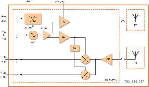 The main field of application for the 120-GHz transceiver radar front-end is in short range radar systems with a range up to about 10 meters. By using dielectric lenses or reflectors, the range can be increased considerably. The RFE can be used in FMCW mode as well as in CW mode. Although the chip is intended for use in the ISM band 122 GHz – 123 GHz, it is also possible to extend the bandwidth to the full tuning range of 6 GHz.
