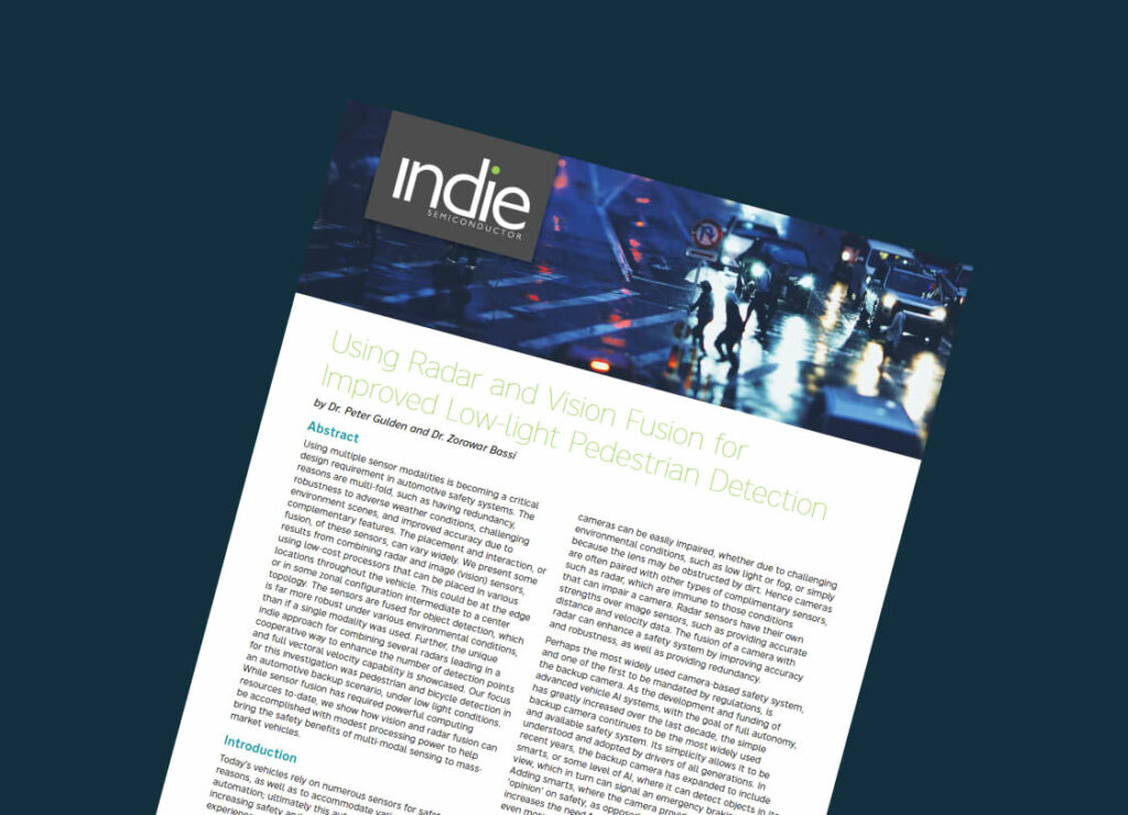 The increasing number of short-, mid- and long-range radars now being incorporated into vehicles mandates cost-effective solutions – solutions such as indie’s highly integrated, low-power radar hardware and software technologies that support high-precision radar sensing for real-time object detection and distance measurement.